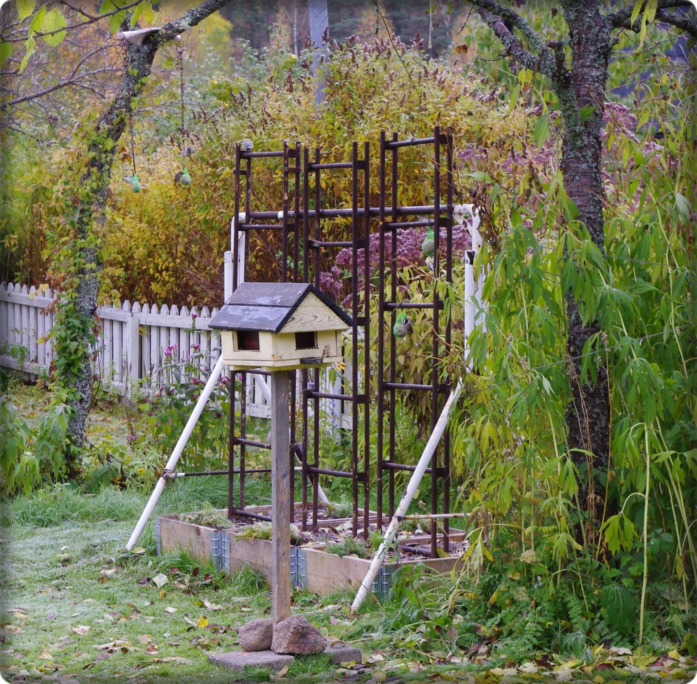 Jag har allt samlat...fågelhusbordet står nära ett träd och hammockklätterställningen. I den har jag hängt talgbollar. Det har jag också gjort i okets krokar: