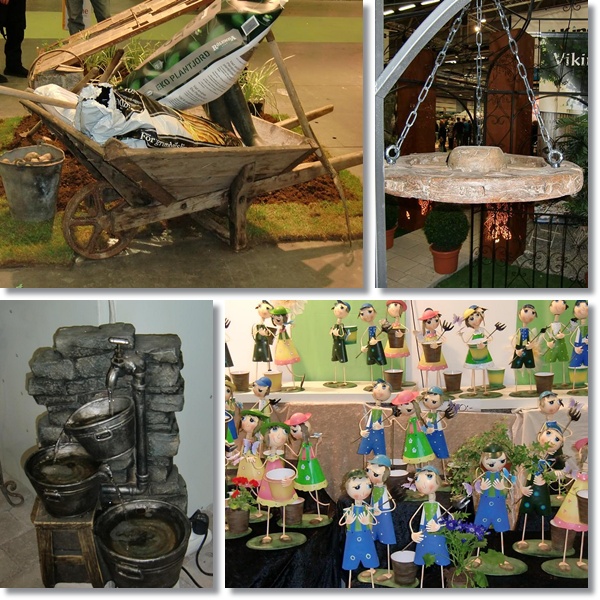 Skottkärran blev jag också förtjust i! Bilden överst till höger är en ljuskrona gjort av ett gammalt trähjul! Vattenfallet ger mig också egna idéer! Sen på den sista bilden fick det bli en massa trädgårdsfigurer!