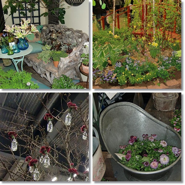Överst till vänster hade dom gjort en underbar soffa av grenar! Till höger en liten bro över blommorna! Om man vill att trädet ska blomma kan man göra som den understa bilden till vänster...en massa små vaser hängs upp i trädet! Zinkbadkaret skulle jag gärna vilja ha!