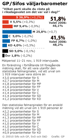 "I Synovate/Temos nya opinionsundersökning får socialdemokraterna, vänsterpartiet och miljöpartiet 58,5 procent jämfört med 37,9 procent för de borgerliga regeringspartierna. Skillnaden mellan blocken på 20,6 procentenheter är den största i opinionsinstitutets 29-åriga historia." http://www.svd.se/nyheter/inrikes/oppositi...tort_789653.svdAtt folk grundligt skulle ändra sina värderingar på 2-4 år är osannolikt, snarare handlar det mer om ytliga saker som partiledare, mediadrev, etc - åt båda hållen, 2008 var ju borgarna impopulära eftersom media hade skrivit en hel del om deras politik, numera kan ju Filippa Reinfeldt strunta i att ställa upp på intervjuer gällande den (sannolikt) brottsliga utförsäljningen av gemensam offentlig egendom eftersom media är mer fokuserade på oppositionen än på de styrande.