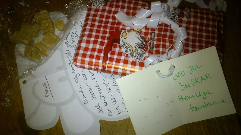 Som ni ser på fudgen, så HAR Tomten mkt att göra, han är liiiiite ovarsam med paketen. Sonen tyckte det var BRA; han åt snabbt opp de värst tilltryckta bitarna och smulorna, innan jag ens hann få fram kameran !