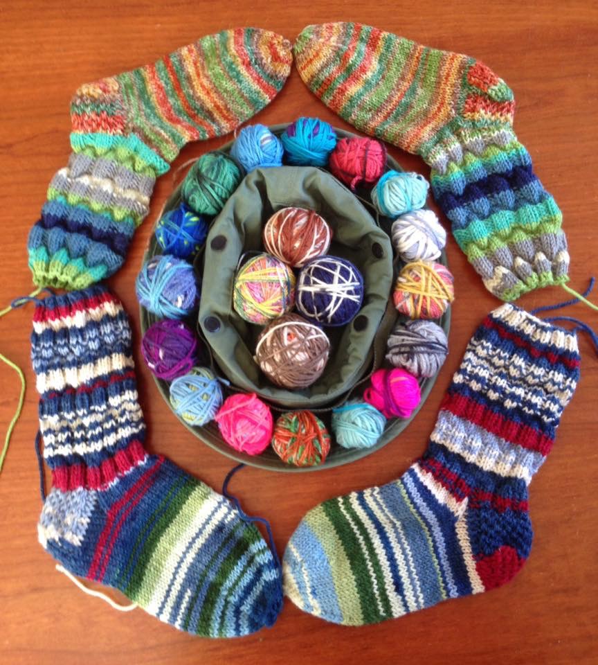 Stickar sockor på löpande band men inte tycks garn nystan tar slut istället blir det mängder av små bollar!