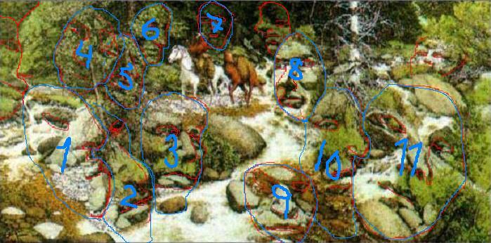 Hur många mänskliga ansiken hittar du? Det finns 11 De flesta hittar fyra eller fem. Hittar du åtta, så är du observant. Nio så ligger observationsförmågan högt över genomsnittet. Tio så är du extremt observant. Elva mycket extremt observant eller har sett bilden tidigare.