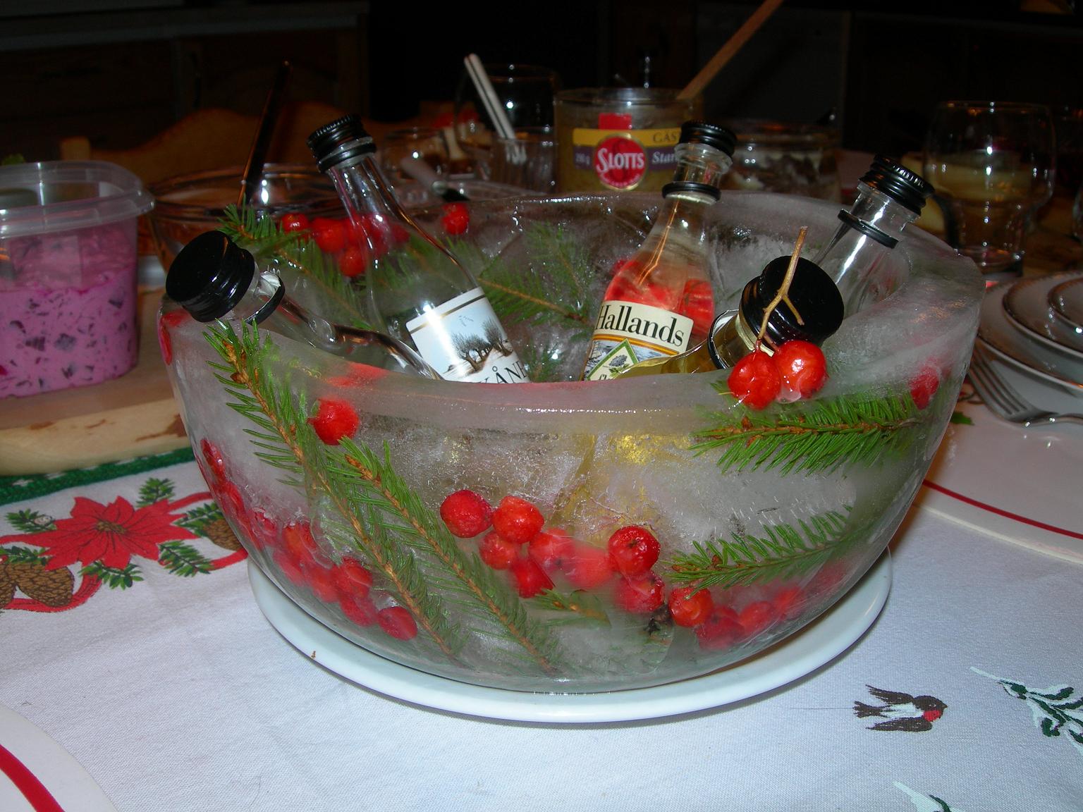 Ta t.ex två av de största beredningformarna och lägg ner några grankvistar och rönnbär eller annat färggrant emellan, fyll på vatten men håll emot så att inte den mindre formen flyter upp för mycket. Fixera med maskeringstape och ställ in i frysen. Tänk på att den kan spricka ganska lätt om man doppar den i hett vatten, så ta hellre lite ljummet vatten och spola botten med. Tips! Om man kokar vattnet först innan man häller det i bunken så blir isen klarare.