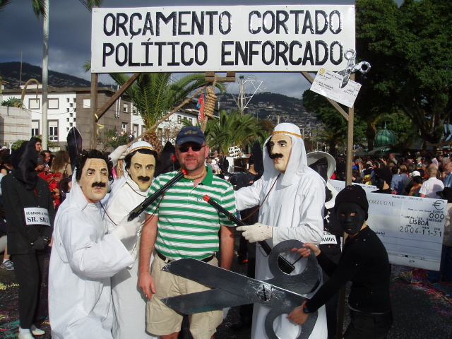 Blev lite inspirerad av Farbror Blås "punkfoto". Förra året blev jag ofrivilligt indragen i karnevalståget i Funchal. Den här vagnen kombinerade två av årets populäraste tema: Avrättningen av Saddam Hussein och protesterna mot den hårda abortlagen i Portugal. Min roll blev att både hängas och kastreras i en allt-i-ett-lösning. Mina arabiska "kompisar" tog kortet.