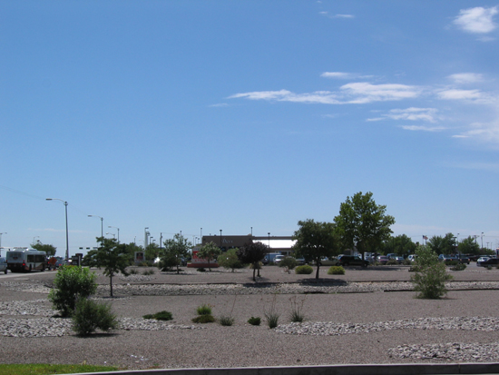 En plantering med grus, sten och olika växter mellan en mack och ett köpcenter. Fick bara med en liten del, hur stor som helst.