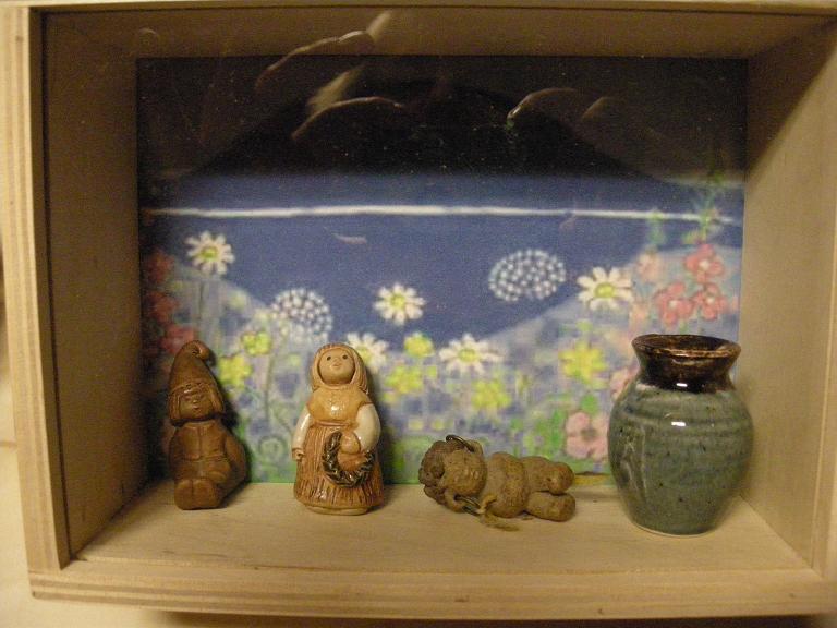 Träljusstake, som sonen gjorde i träslöjden för många år sen, handstöpta ljus inhandlade på scouternas julbasar. Mossa från egen skog, murgröna(som håller sig länge instucken i mossan. Allt står på en spegel.
