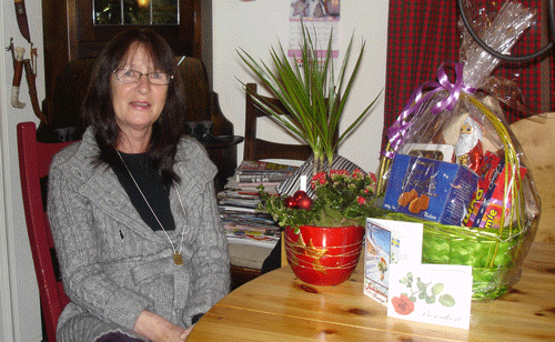 Nu har jag varit hos Titti, och hon blev rörd till tårar när hon fick en stoooorkorg med choklad, en liten julgrupp och ett presentkort från Quilterian från Er och mig och min man (jag tog mig friheten att vara med på ett litet hörn jag också) santa.gif