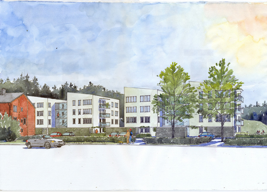 Detta är byggföretaget Besqab coh arkitektföretaget Joliark som föreslagit denna bebyggels mitt inne i ett villaområde. Det har dom gjort utan att ens utreda andra alternativ som tex någon form av radhusbebyggelse. Det är ganska okänsligt att smälla upp ett flerfamiljhus på detta sättet.