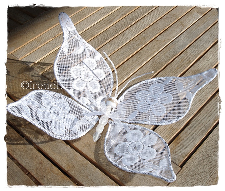Det är kul att utveckla sitt pysslande. Jag har inte gjort fjärilar med spets förut. Från den ena stora vingen till den andra stora vingen är det ca 28 cm.