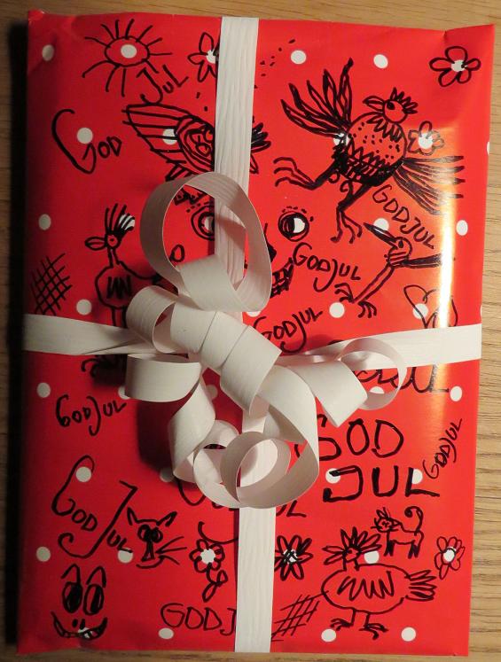 Tack snälla tomten!  Du har skickat till rätt person, för jag är inte en sån som sliter upp pappret, jag pillar försiktigt, och det här konstverket tänker jag spara  Vem är det som är duktig på att teckna?