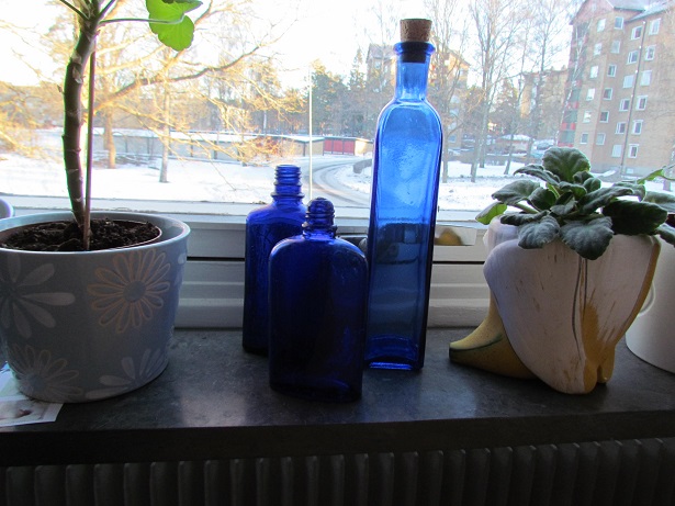 I köksfönstret BILD 3. Mina barn hittade de 2 minsta flaskorna vid en stenmur när vi bodde på landet. Jag älskar blått glas.
