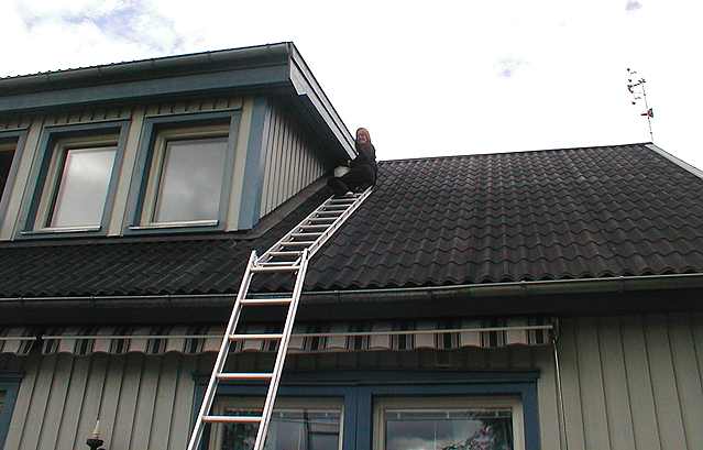 Ojoj, jag är helt ledbruten. Idag gjorde jag det jobbigaste av alltihopa, målade vindskupan. Skylift o sånt e ju fusk så vi gjorde en egen variant med en stege efter takteglet som var fastgjord i ett rep som var förankrat i bilen på andra sidan huset. Den lättaste o vigaste personen fick klättra upp = jag. smile.gif På så sätt tog jag sidorna av kupan.