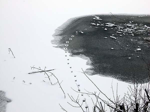 Annandagen. Udden som jag röjer med Banverkets tillstånd låg där snötäckt, det hade kommit mer snö under natten. En rävhona hade varit där och spårat i förgrunden. Eftersom det bara var lite snö i spåren hade hon gått där på morgonen.