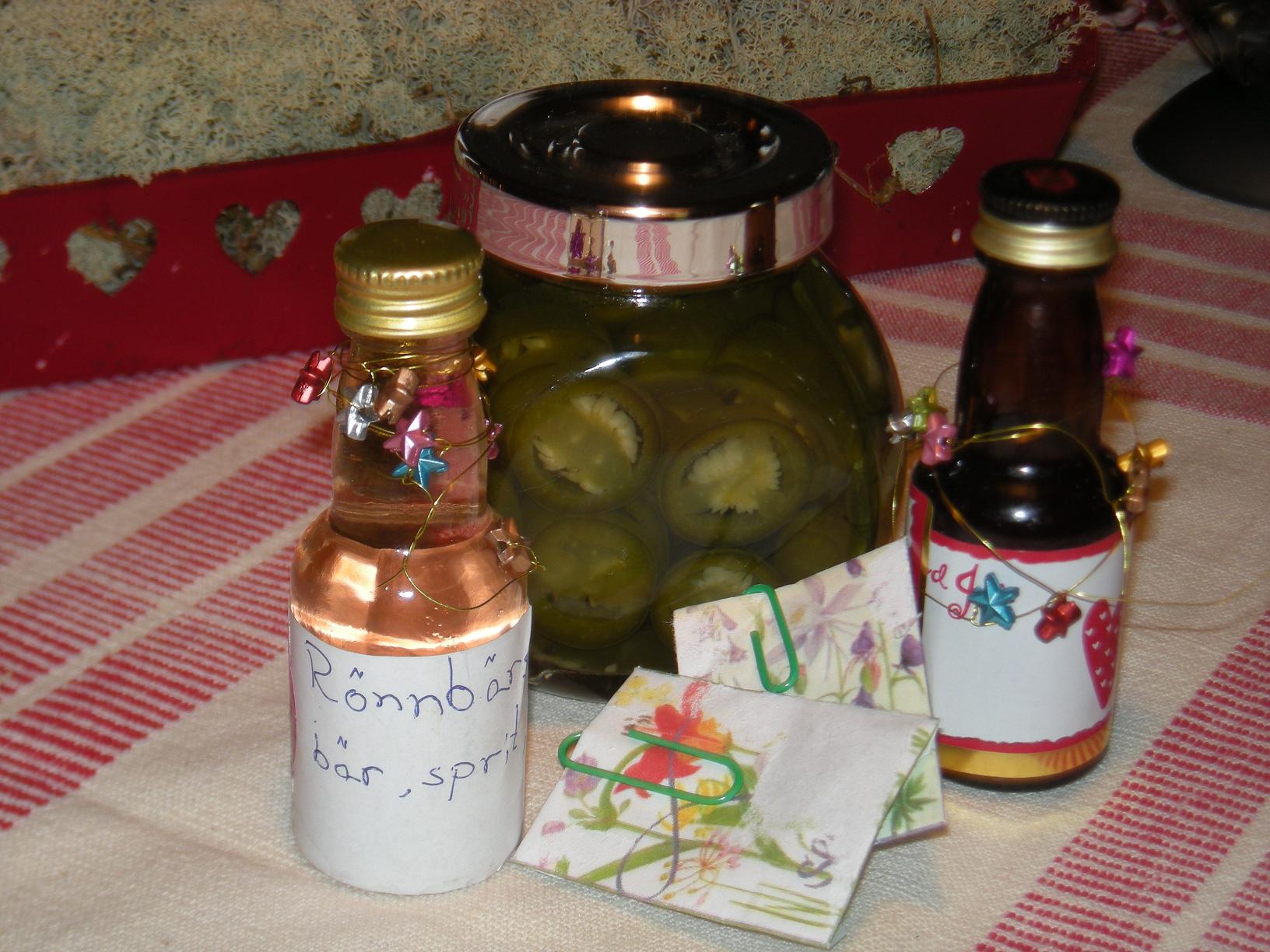 En fin burk med nån form av syltad peppar tror jag och två jättesöta små flaskor med bl.a. rönnbär i den ena och i den andra har jag ingen aning om vad det kan vara. Som om det inte var nog så var där ju två söta små fröpåsar också