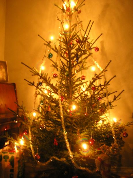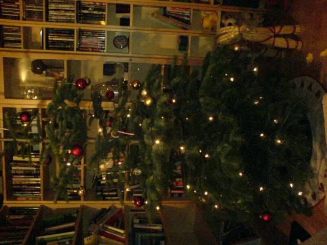 Granen klädd 12-12. Miljövän = plastgran inköpt dec 1990, extrapris 245kr (ordinarie pris 360kr) Ljus, röda glaskulor och glitter är enda dekoration. utanför fönstret syns stjärnhimmel (ljusnät) granen 2008 2.JPG