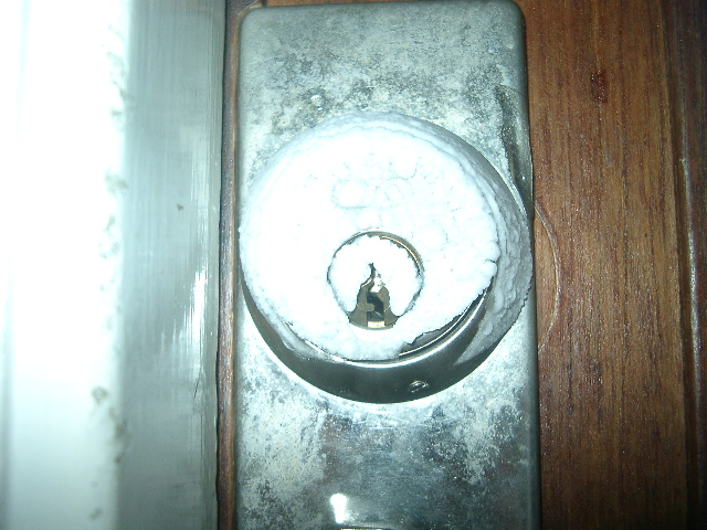 Har dubbla kolvar så vi kan låsa från insidan med nyckel också eller trycka på en spärr när vi åker bort så man måste låsa upp med nyckel inifrån för att komma ut genom dörren och då blir det så här även på insidan när det är riktigt kallt, luften inne är ju fuktigare än ute då.