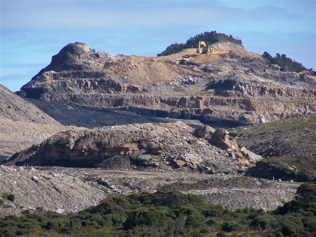 . Dagbrottsgruvor förstör all vegetation, jord och berg ovanför det material som bryts, ibland lämnar stora ärr. På västkusten vid Stockton är numera berget Mt Augustus helt borta. Snigelarten Powelliphanta augustus som upptäcktes 1994 fanns endast bara på berget Mt Augustus som i detta nu krossas för att utvinna kol. Tusen sniglar har omlokaliserats, men med dåliga resultat och höga dödssiffror och för närvarande är resterande sniglar i ett slags fruset limbo i stora frysrum i Wellington där två heltidsanställda på Department of Conservation sköter om dem.