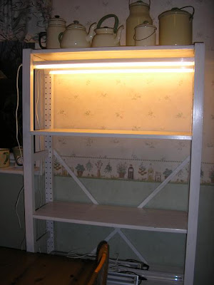 CITAT (Fröken Knuff @ 14-08-2010, 01:24)  Verkligen sant! Usch jag bävar redan för det kompakta mörkret och funderar på hur jag ska fixa bra och gärna hyfsat snygg belysning så att odlingen kan fortgå inomhus i vinter... någon som har några tips??  Den här hyllan har jag i köket: När jag förodlar mina blommor så brukar jag ha mina sådder i min såhylla. Det är en Ikea-hylla som jag har målat vit. Under varje hyllplan har jag två lysrör. På denna bild har jag bara fått upp lysrören under den översta hyllan: jan-feb