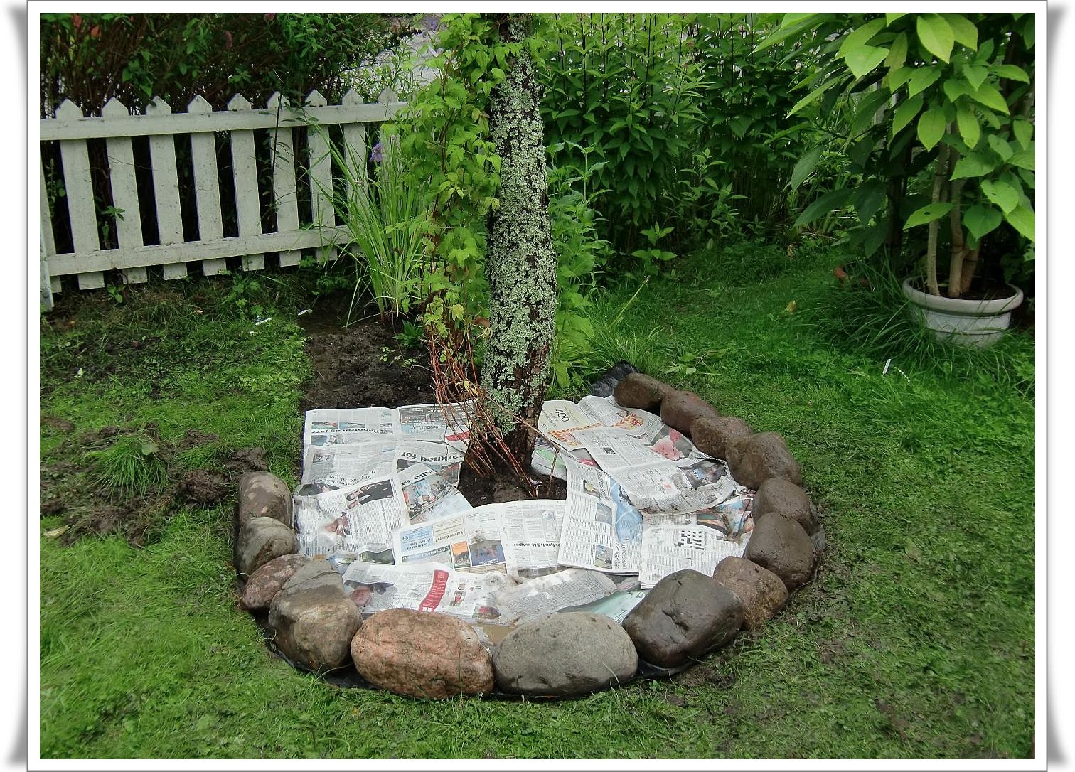 Eftersom det är så mycket ogräs här la jag tidningar i botten: