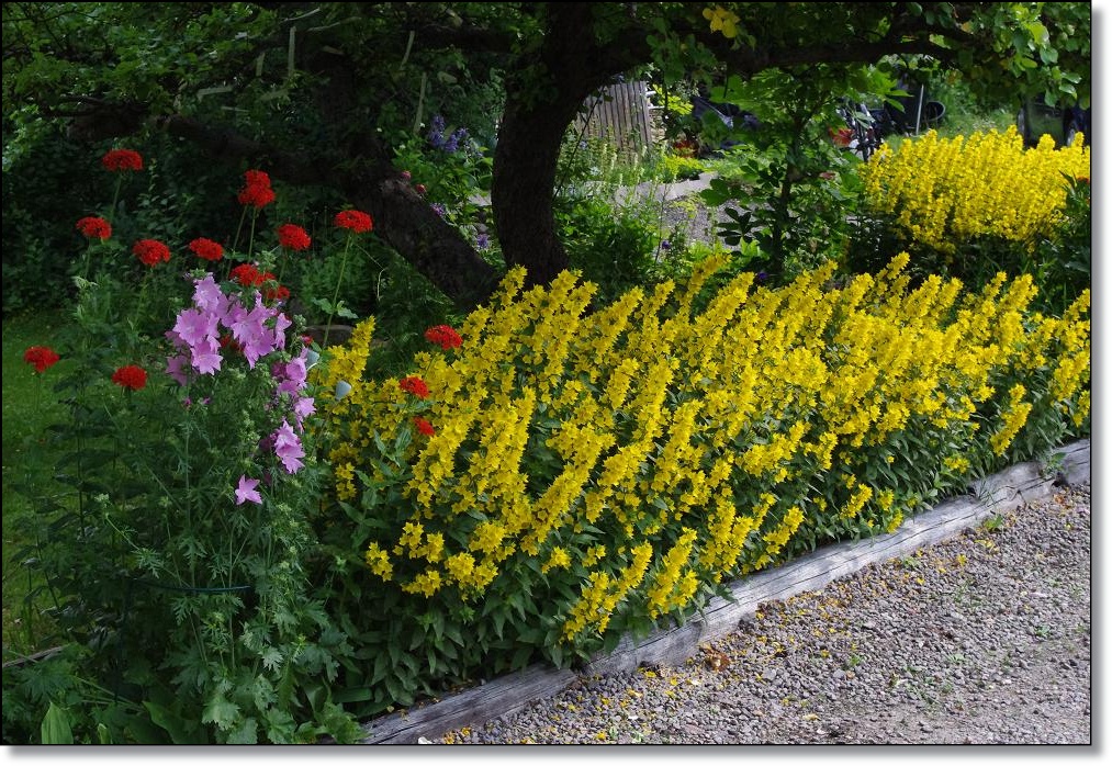 Eftersom jag klagat lite på i mitt tycke tråkiga trädgårdar blir det upp till bevis. Den här biten av trädgården börjar jag bli nöjd med. Växterna skall välla fram och gräsmattan skall bestå av gräs.  Så småningom blir det ett snyggare och bättre rådjursstaket.  Bakom går en liten smal gång.  Jag läser ovan om stjärnflocka. Det är en trevlig växt men klipp bort fröställningarna INNAN de fröat. Jag har stjärnflocka nästan överallt.