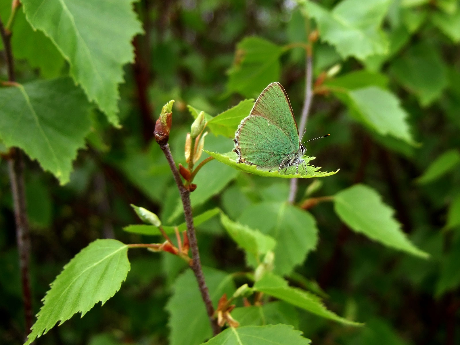 Växten på bild 1 vet jag tyvärr inte. Men på bild nr 2 sitter Grönsnabbvingen på ett björkblad.