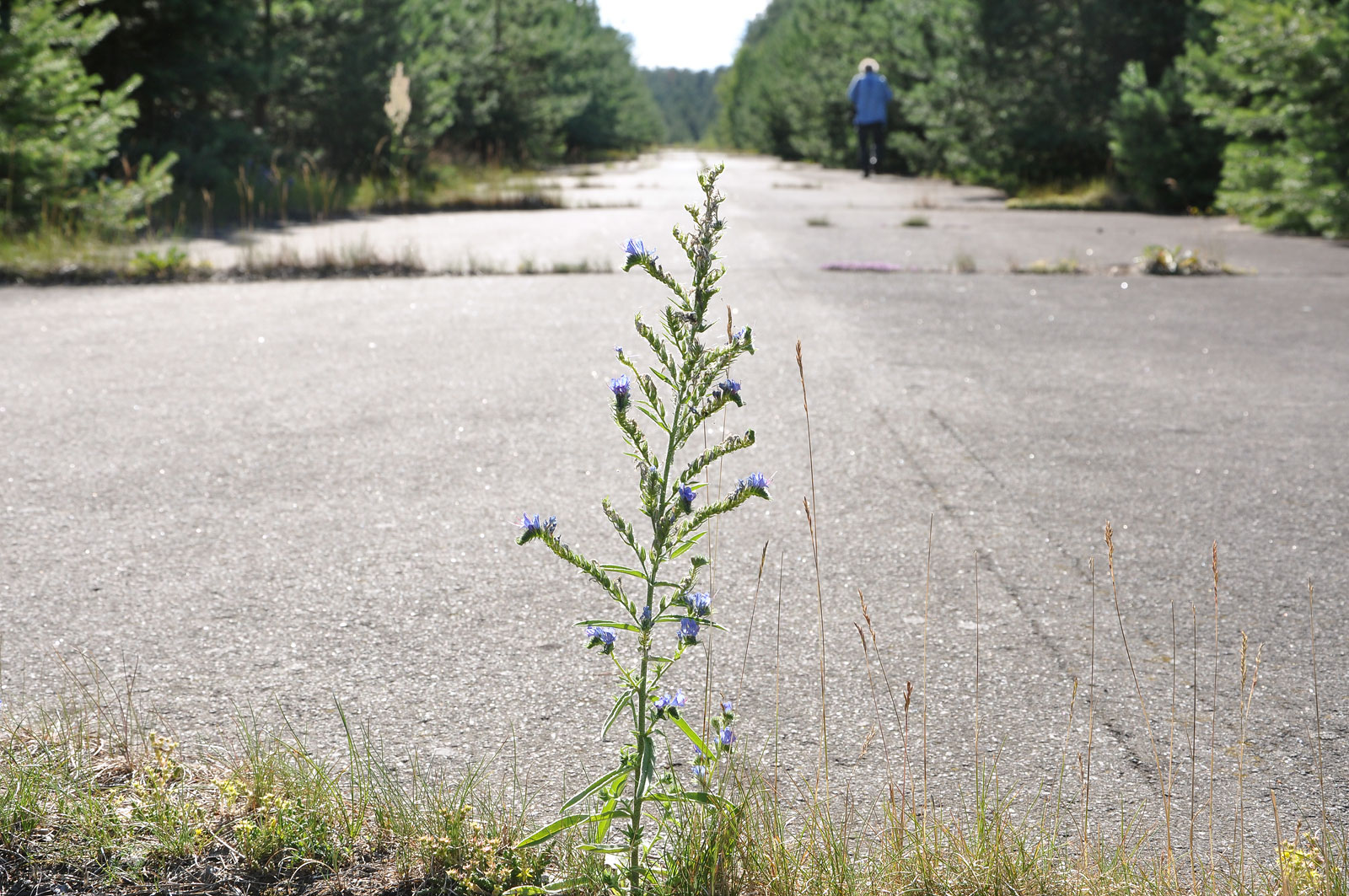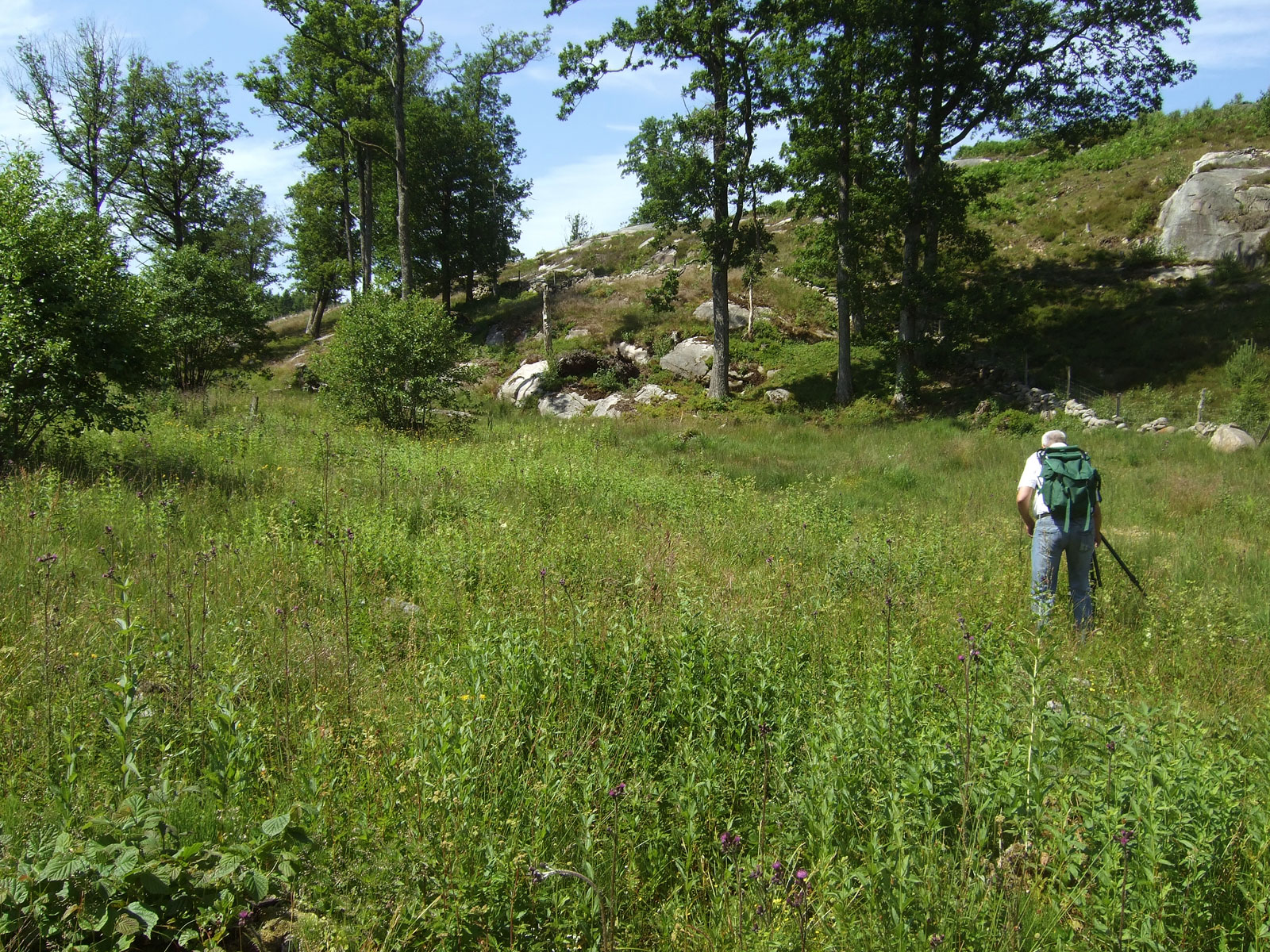 13. Du menar den höga med kransar av lansettlika blad? Den påminner om flera växter men jag kan inte avgöra vad det är. Från personens fötter fram till höger om snåret mitt i bilden (längs ett dike?) finns ett stråk älggräs.