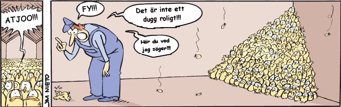 CITAT (Reserv @ 11-03-2006, 10:56) CITAT (andersen @ 11-03-2006, 09:34) CITAT (Scrollan @ 11-03-2006, 09:14) Ser inge roligt i det, folk blir arbetslösa, och djuren dör  Vilka blir arbetslösa? Om nu smittan skulle va´så farlig så är det väl inte hönsuppfödare du menar skule bli arbetslösa.....eller?  Och jo visst, dom sjuka djuren dör, men den tecknade bilden föreställde en liten kyckling som skulle skämta med sina kompisar. Är du verkligen så humorlös som du framställer dig, eller är du bara motvalls käring i allt som andra kan tyckas va´skoj? Jag tyckte i alla fall att båda bilderna va´skitkul  Reserv i tex Thailand som är en stor expotör av kycklingar till bla sverige, har kyckling farmer stängs igen, samma sak i kina. Det är inte bara hönsuppfödare som blir arbetslösa utan livsmedels arbetare kommer att drabbas på sikt om sjukdomen sprider sig, då blir bagare, livsmedels arbetare på kronfågel mm utan jobb, om jag har humor ja det tycker jag att jag har, men det här är för allvarligt att att ha roligt åt, det påminner en hel del om tråden där man hadde roligt att nidtekningarna på dom muslimska profeterna, det hadde många av odlas medlemmar väldigt roligt åt, att folk dog det brydde man sig inte om