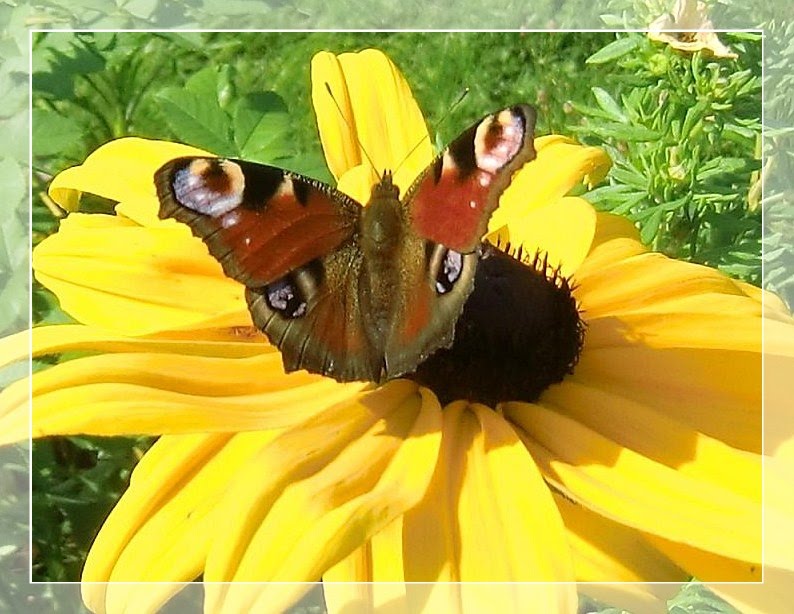 Mina blommor har en massa besökare....bin, humlor och fjärilar. Idag tog jag kort på några fjärilar:  PåfågelögaEn annan fjäril hade skadade vingar:  Nässelfjäril