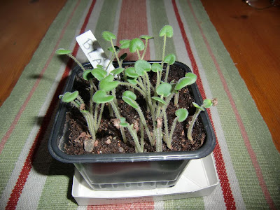 Det skumma är att Basilikan, som enligt fröpåse ska ta ca 10dagar på sig, ploppade upp efter endast fem dygn! Och Heliotropen var ännu djärvare, istället för 14 dagar kom den upp efter 6!