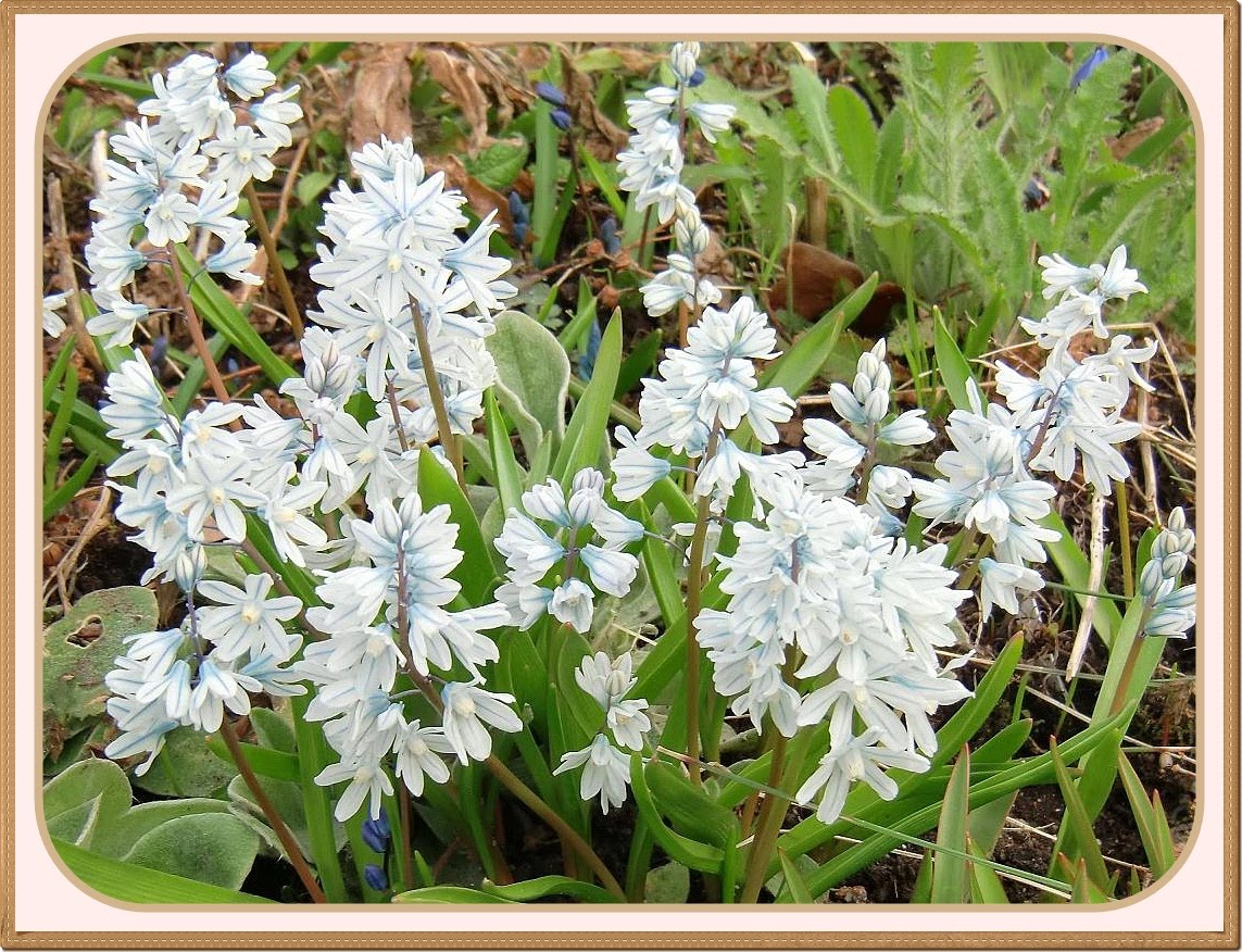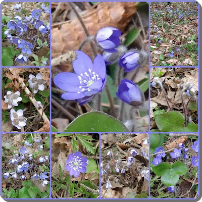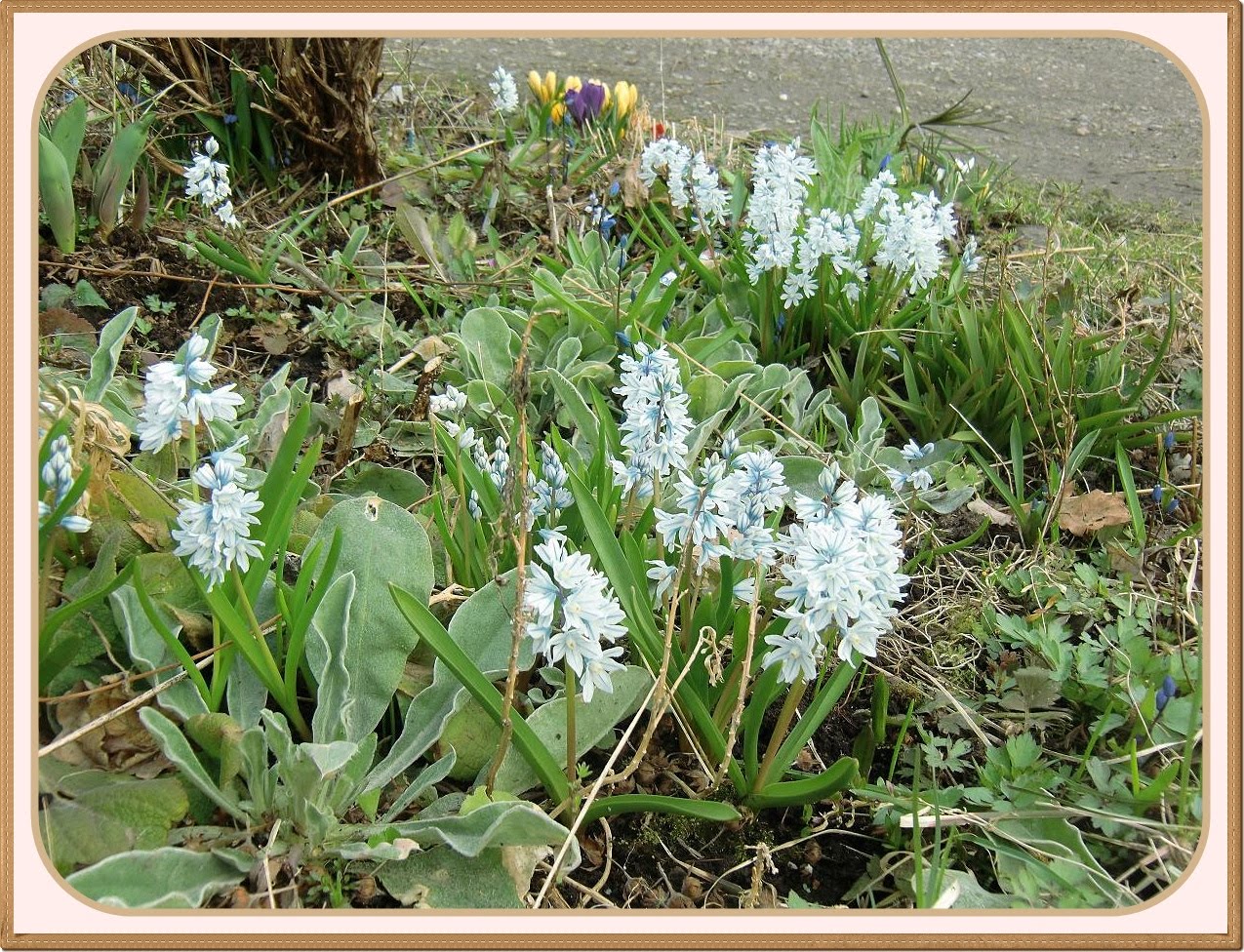 Lungörten hae en stor fet knopp på gång precis som bergenian... Scillorna har färgat gräsmattan alladeles underbart blått, rabarbern visar små skrynkliga blad, aklejan är alldeles krusidullig, tussilagon är gul utmed vägarna...