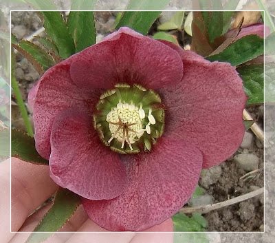 Nu blommar julrosen som jag köpte förra året:  Det svåraste med att ta kort på en julros är att man nästan får ligga på marken för att få ett bra kort! Hihi..jag undrar vad grannarna tänker! För att ni skulle kunna se bättre hur vacker den är så fick jag ta hjälp av min hand: