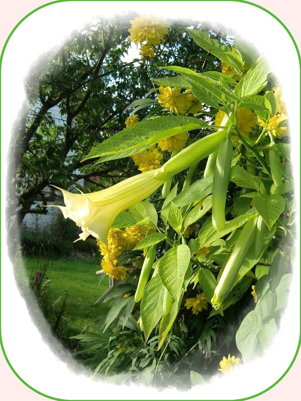 Vilken underbar trädgård du har, Gunilla! Nu blommar den första änglatrumpeten. Blomman ser ännu vit ut men den kan ändra sig och bli mer rosa. Jag är lite osäker på vilken färg den kommer få till slut! Jag har så många änglar så jag har blandat ihop dom lite. Det är så härligt med den första blomman:  Det här är den första änglatrumpeten som blommar! Jag har 9 st änglatrumpeter i olika storlekar och av dom är det 8 st som har knoppar....härligt!