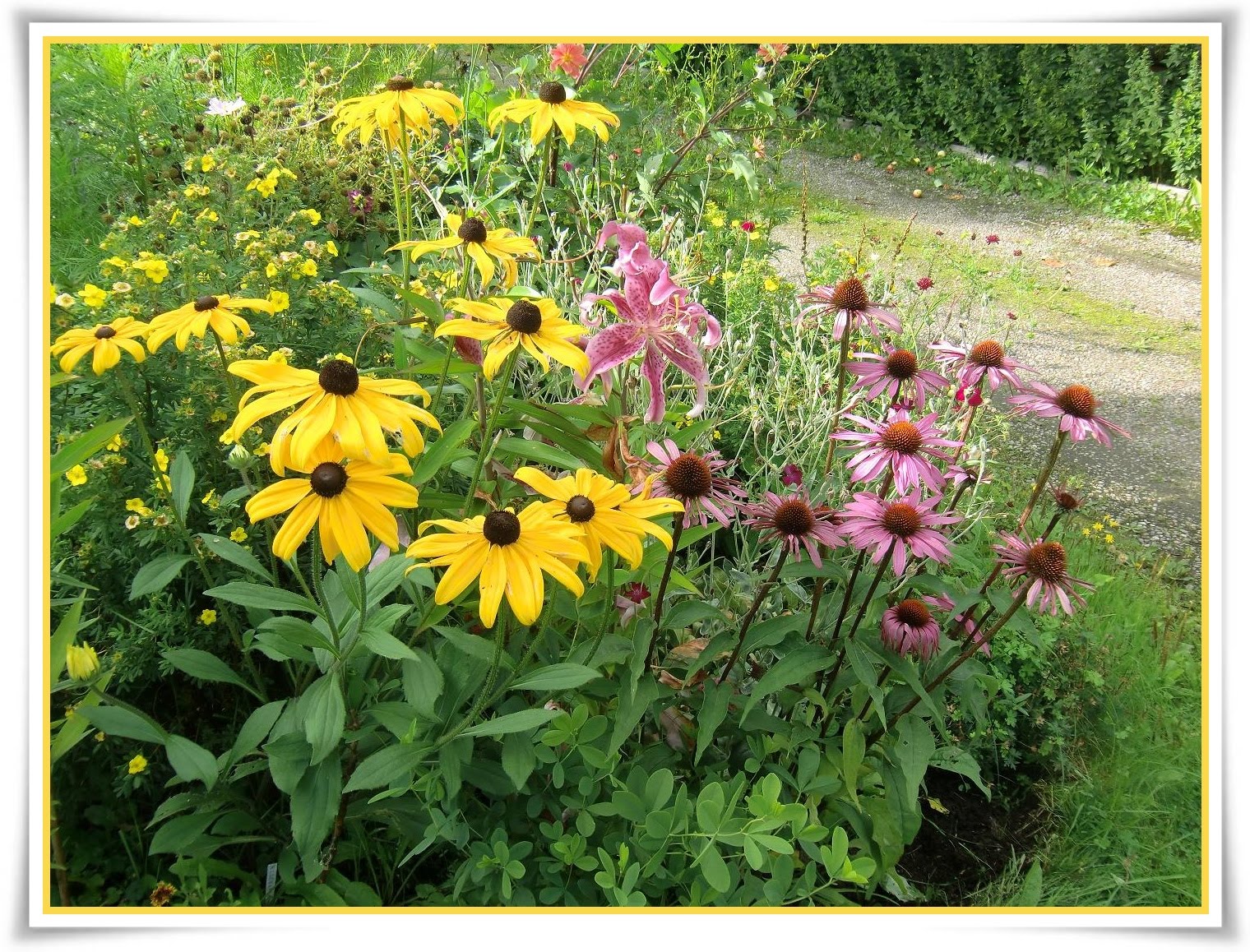 Vilken tur att jag sådde flera liljefjäll för två år sen. Nu blommar ännu en av dessa sådder!  Visst är den fin!Här blommar den tillsammans med en annan lökfjällsådd lilja:  Den här okända Rudbeckian blommar och blommar och blommar:  Jag vet inte vad den heter för jag har fått fröerna och det stod bara okänd rudbeckia på påsen! Det var förra året jag sådde den och det var bara en planta som grodde men ojoj vad den blommar! Härlig är den!