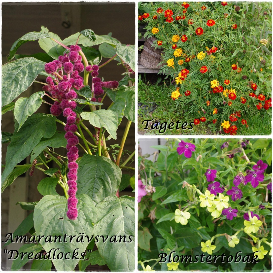 Ännu blommar det en massa blommor framför min altan! Änglatrumpeterna har kommit igång för fullt nu! Även en massa andra blommor har inte gett upp ännu:  Dom här blommorna är fortfarande fina:  Amaranträvsvansen är en nyhet för mig. Riktigt annorlunda och kul är den! Den har jag inte sått förut! Jag hoppas att det blir frön som jag sen kan ta rätt på! En del av mina blommor har ännu inte fått mogna frön! Därför har jag inte tagit bort så många blomkrukor ännu! Jag hoppas att frosten dröjer. Men jag hörde något om att det ska bli kallare nästa vecka så vi får se hur det blir!