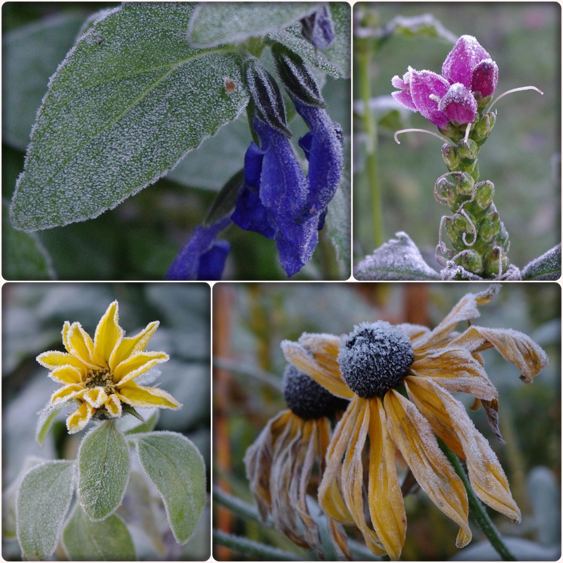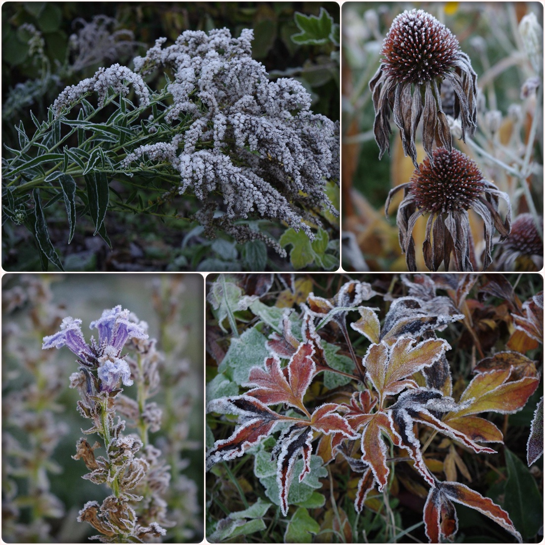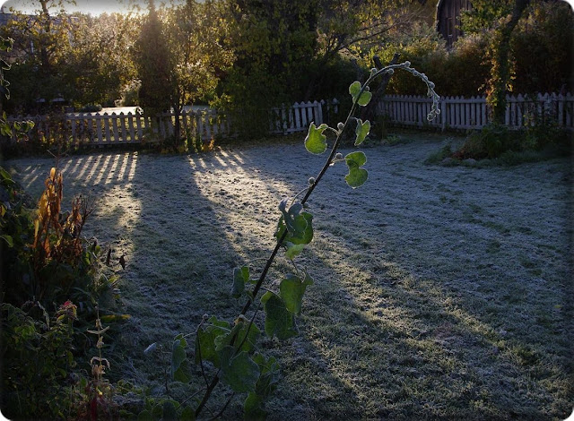 Imorse visade termometern på - 4 grader och trädgården hade klätt sig i en frostskrud! De frostade blommorna och bladen är så vackra...även om det känns lite deppigt att sommaren är slut! En frostkavalkad bjuder jag er på idag:    Som avslutning får ni se hur det såg ut i morse när solen kom fram och glittrade i gräsmattans frost: