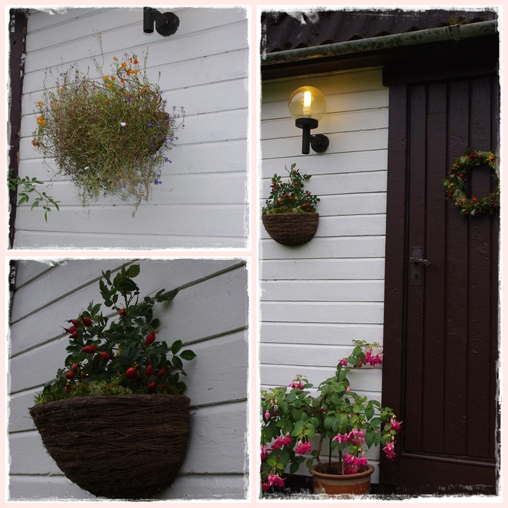 Flera av mina änglatrumpeter blommar nu och den som blommar mest just nu är en ljusrosa ängel. Den blommar nu med 10 klockor och har flera knoppar på gång. Det är inte en av mina största änglar och jag hade hoppas att den skulle ha gula blommor men så var det inte! Men jag är så glad att den blommar så fint och sen doftar den underbart på kvällen. Här är en bild från igår:  Väggampeln som sitter på lilla stugans vägg har sett så tråkig ut! Blommorna hade blommat över och nu när jag har en höstkrans på dörren så ville jag ha lite höst i väggampeln. Så jag klippte bort det torra men lät jorden vara kvar. Sen la jag lite mossa överst och pyntade med nypon:  Bilden överst till vänster är en före-bild och de andra är hur det blev...